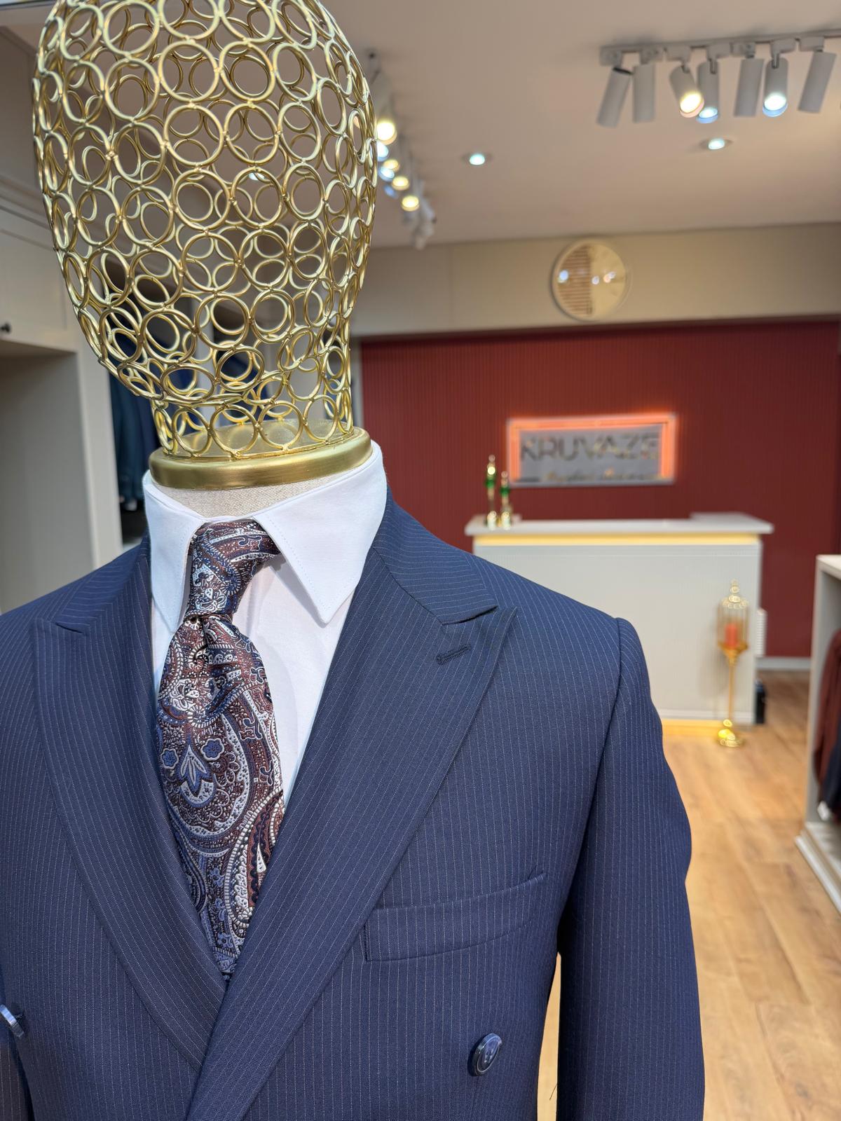 İnce Çizgili Lacivert Kruvaze Takım Elbise